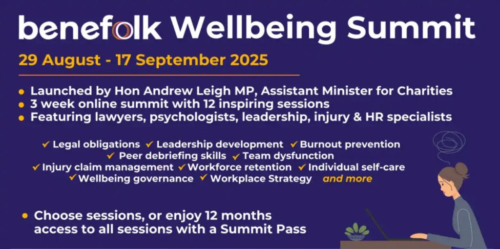 We are so appreciating being members of Benefolk, a purpose-driven network that brings people and ideas together to amplify impact. Benefolk Workplace Wellbeing Summit (29 Aug – 17 Sept) The Benefolk Workplace Wellbeing Summit is a 3-week program designed to support thriving cultures in the for-purpose sector. The Summit kicks off with an online launch […]